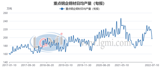 據中國鋼鐵工業協會統計數據顯示,2022年7月上旬重點鋼企生鐵日均產量191.55萬噸,旬環比下降2.09%,同比上升2.98%;7月上旬重點鋼企粗鋼日均產量207.48萬噸,旬環比下降1.98%,同比下降2.94%;7月上旬重點鋼企鋼材日均產量197.31萬噸,旬環比下降9.36%,同比上升0.52%。